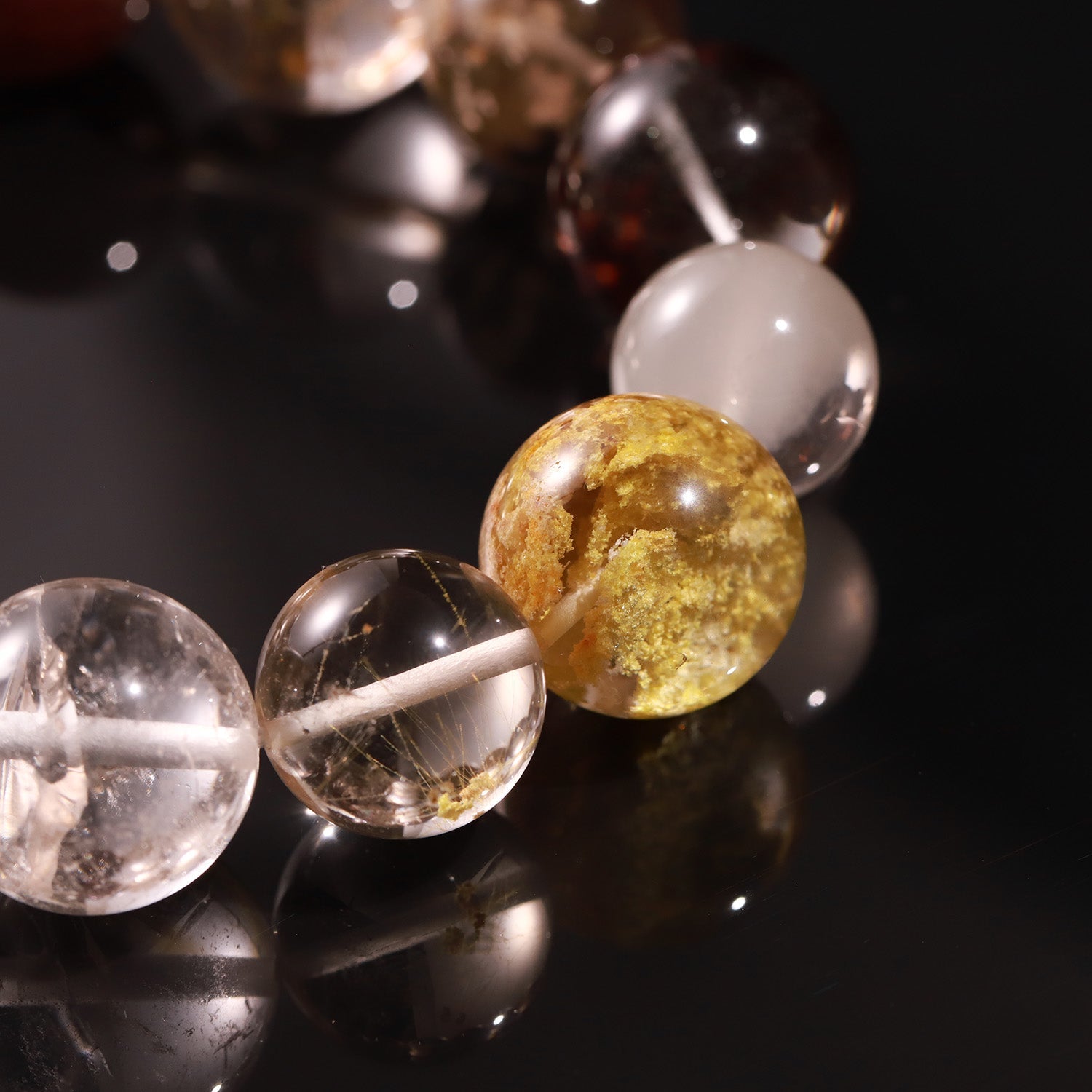 The Elysian Ground Bracelet channels the steady warmth of golden rutilated quartz and the calm depth of phantom quartz.