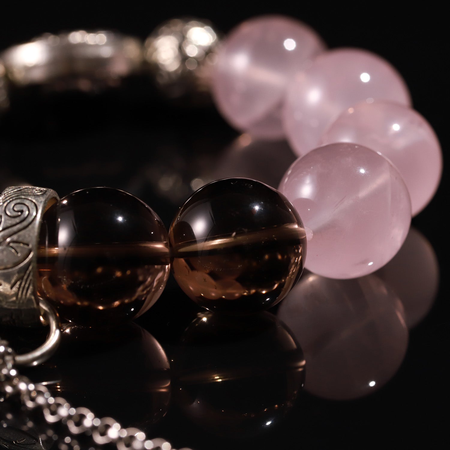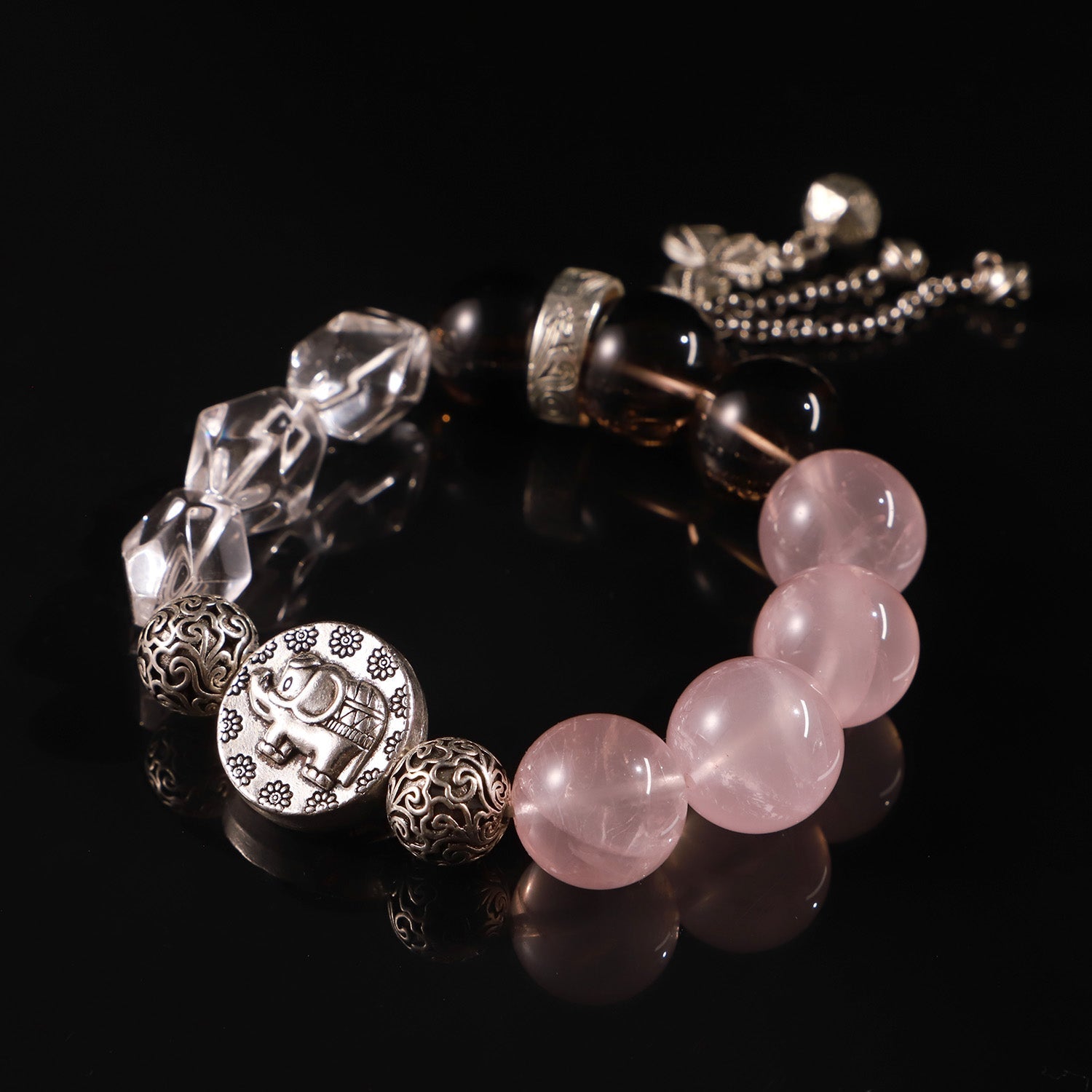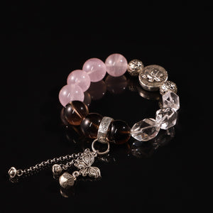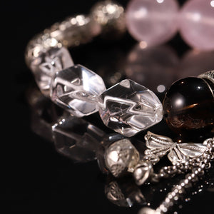 Material: Natural Rose Quartz, Smoky Quartz, and Clear Quartz with silver charms