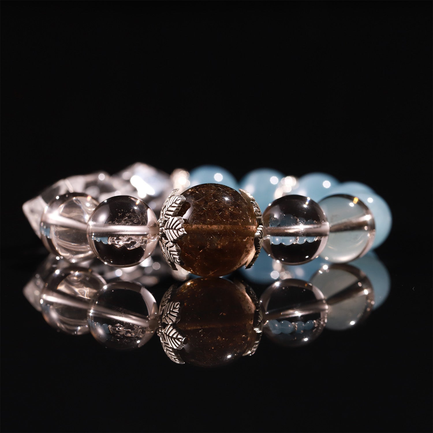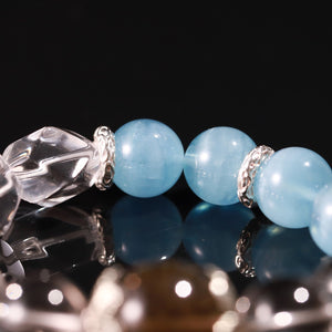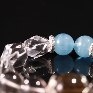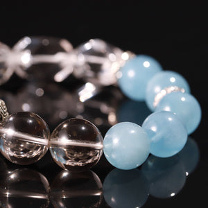 This bracelet harmonizes the grounding power of Golden Smoky Rutilated Quartz with the tranquil clarity of Aquamarine and Clear Quartz.
