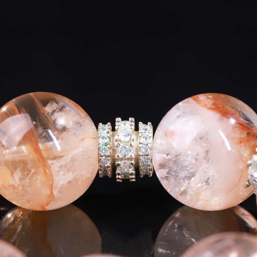 The orange-pink “flower” inclusions inside each bead symbolize blooming vitality, optimism, and quiet good fortune in everyday life.