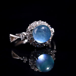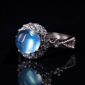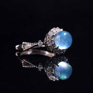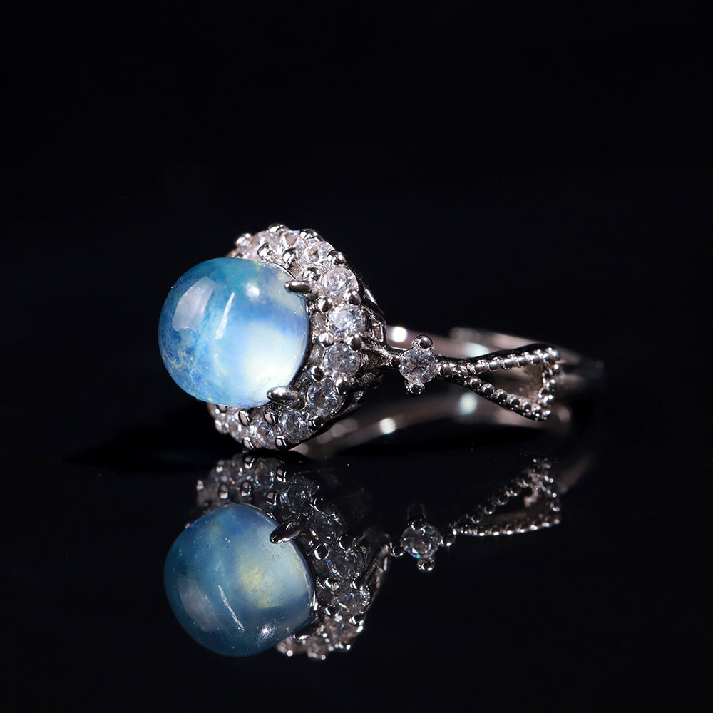 This ring features a single blue moonstone crystal in a delicate silver-tone setting, glowing like a small moon resting on your hand.