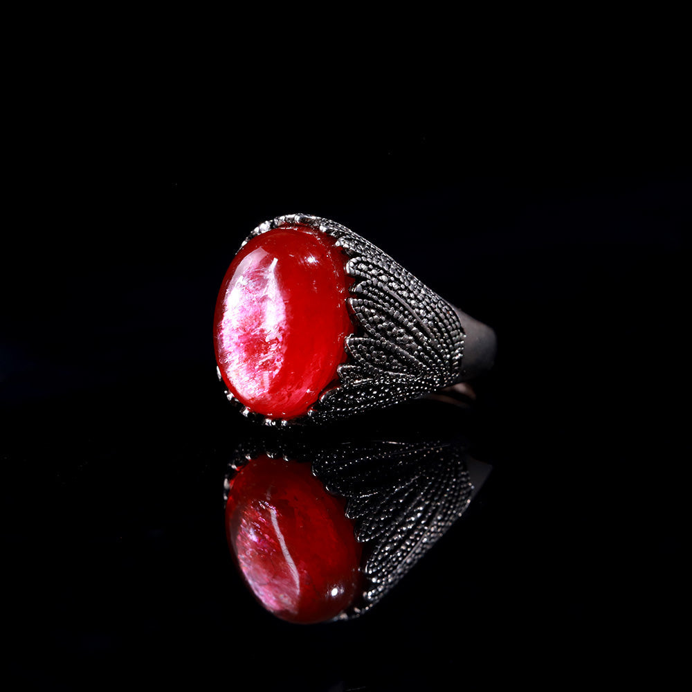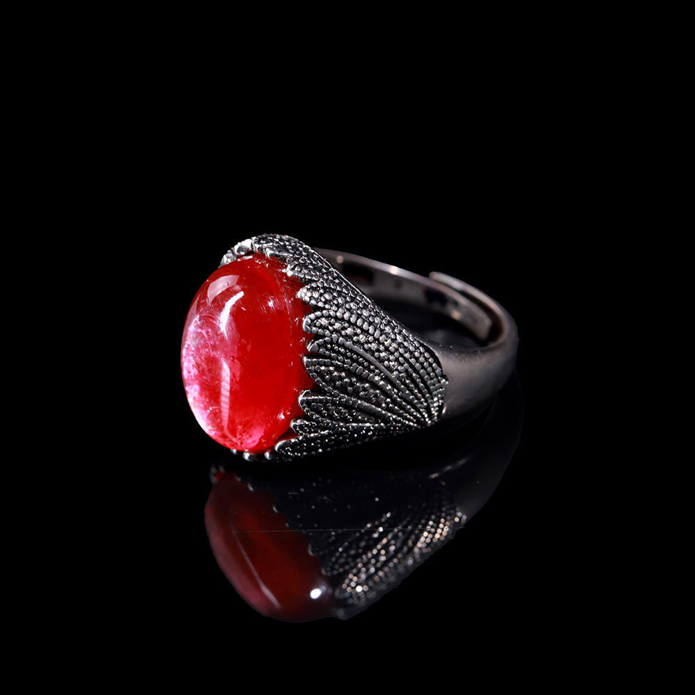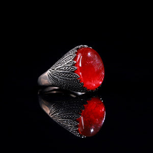 This ring features a bold red crystal cabochon set in an ornate, vintage-style band — like a burning crest of flame at your fingertip.