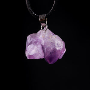 This pendant features a raw piece of amethyst, kept in its natural crystal form for a more direct, unfiltered energy.